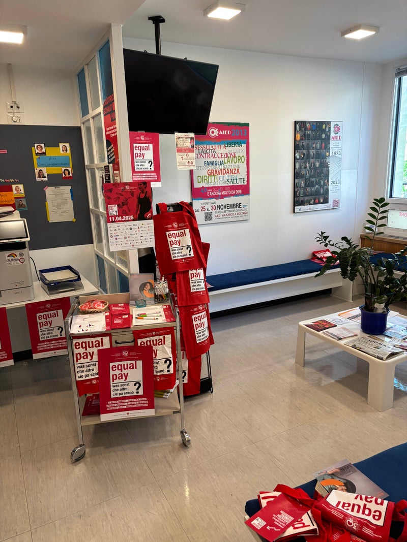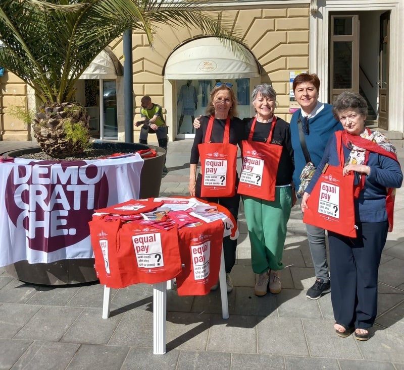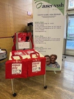 In Form eines Flashmobs am Waltherplatz in Bozen und dann in der Innenstadt wurde Informationsmaterial verteilt und auf unterschiedliche Problematiken wie den Gender Pay Gap, die gläserne Decke bei Führungspositionen oder die weibliche Altersarmut hingewiesen.