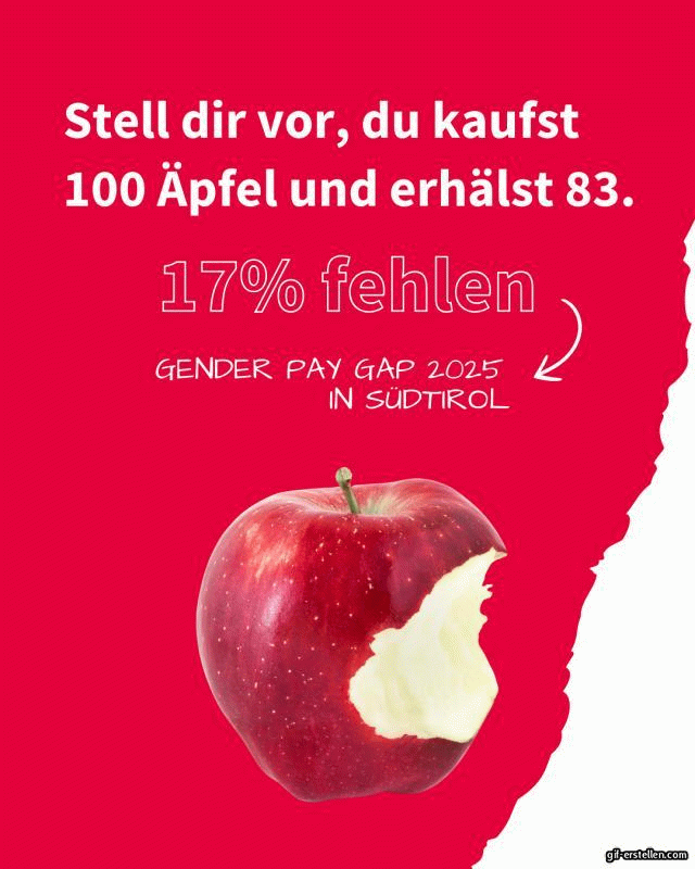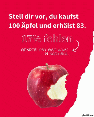 Am heutigen Freitag, 11. April, wird in Südtirol der Equal Pay Day begangen. An diesem Aktionstag wird auf die Tatsache hingewiesen, dass Frauen immer noch weniger verdienen als Männer in vergleichbaren Positionen und mit vergleichbarer Ausbildung. In Südtirol beträgt diese Gehaltslücke, auch bekannt als Gender Pay Gap, 17,3 Prozent. Die statistischen Daten hier: Statistikblatt des AFI