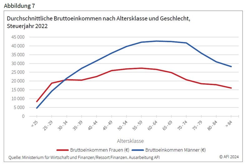 Bei der Einkommenssteigerung sind Frauen im Vergleich zu Männern in ihrem gesamten Lebenslauf benachteiligt. Die Schere öffnet sich bereits ab dem Alter von 30 Jahren und klafft immer weiter auseinander, bis sie in der Altersklasse der 70- bis 74-Jährigen ihren Höhepunkt erreicht: Dort erklären die Männer im Schnitt 21.000 € brutto mehr im Jahr als Frauen.